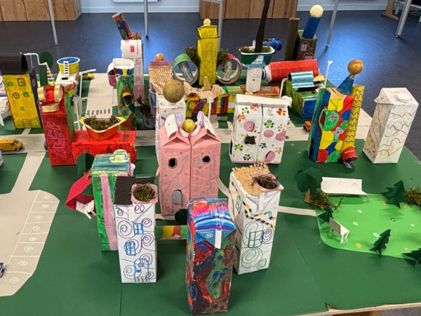 In der Mitte des Raums erweckten die Kinder der 3b Hundertwassers Motto „Kunst ist die Brücke zwischen Mensch und Natur“ zum Leben. Auf einer Holzplatte bauten die Kinder hierfür eine farbenfrohe Stadt, inspiriert von Friedensreich Hundertwasser und Antonio Gaudi. Im Zentrum standen kunstvoll verzierte Häuser, aber auch ein Spielplatz, ein Parkplatz und ein Park durften in der Fantasiestadt nicht fehlen.